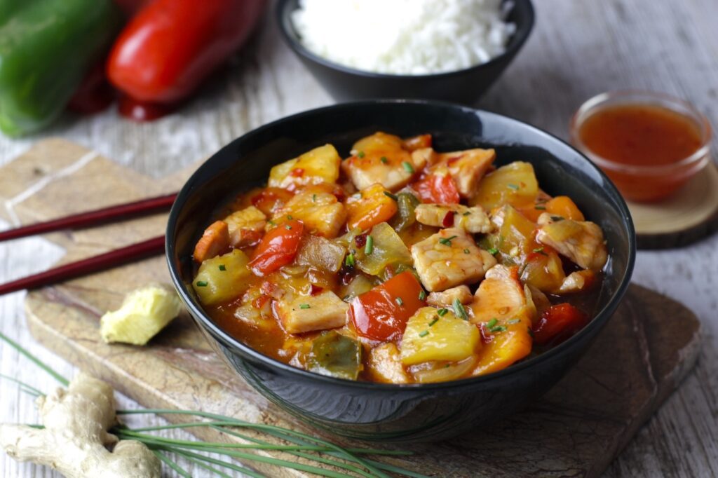 - Cuando la salsa esté hecha y la verdura esté algo cocinada, añadimos a ésta una pizca de sal, la piña cortada en trozos y el cerdo frito. Finalmente, vertemos la salsa agridulce y mezclamos todos los ingredientes mientras dejamos que se cocinen unos 5 minutos más. Servimos inmediatamente.